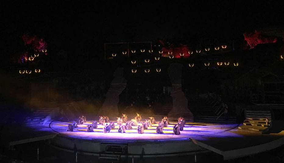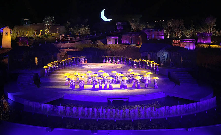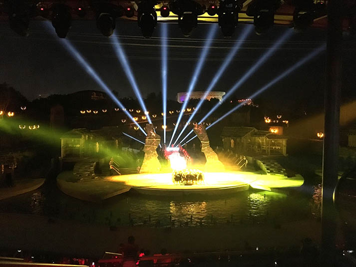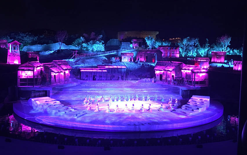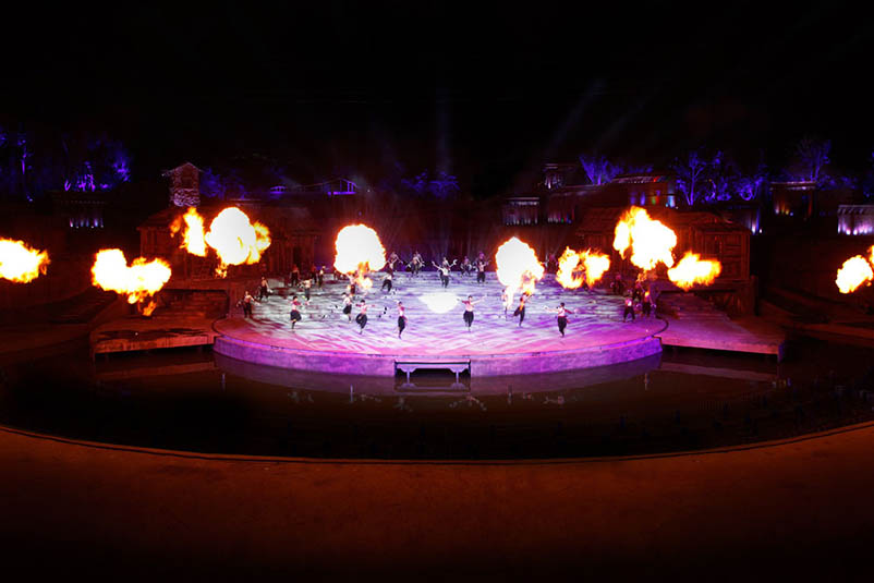 《阿惹妞》作為一部風(fēng)情實(shí)景劇,演出舞臺(tái)全部為戶外實(shí)景,既有遠(yuǎn)山又有流水,場景宏大,因此對舞臺(tái)景物布光要求很高,不僅要使景物光線分布均勻且達(dá)到足夠的亮度,對燈光的層次性要求也非常高,既要保證遠(yuǎn)方山峰的輪廓清晰可見,又要讓觀眾看得清舞臺(tái)中區(qū)演員的表演。G12 HYBRID 能夠做到大范圍均勻鋪光,且具有超高光通量,發(fā)光效率高的同時(shí)具備遠(yuǎn)距離照射的能力,在保證遠(yuǎn)景和中景清晰的前提下,運(yùn)用G12 HYBRID亮度變化,配合現(xiàn)場光焰等特效,能夠制造出極具擴(kuò)張感的震撼視覺效果。