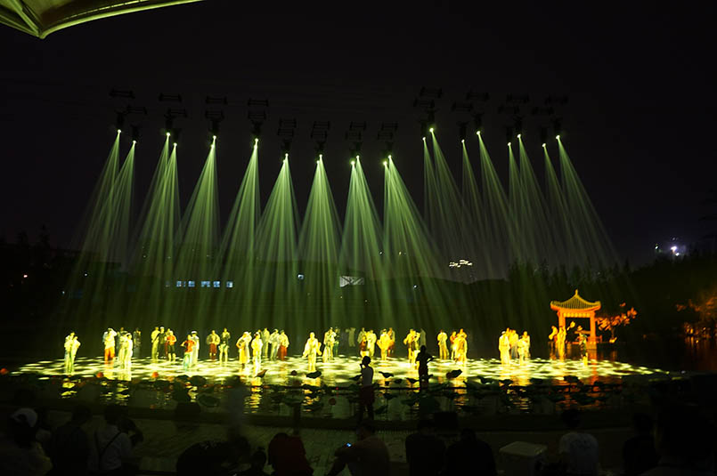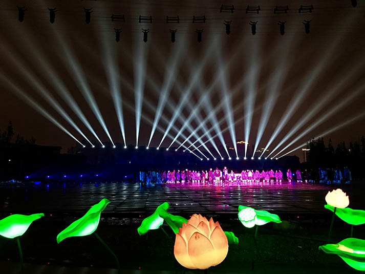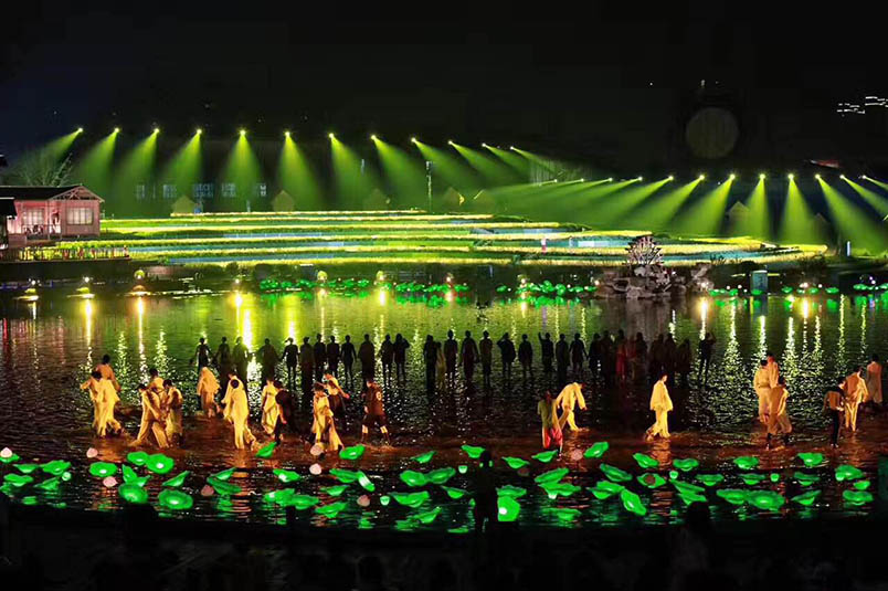 大型田園花火情境實景演出《瀏陽河上》是浩洋團隊繼湖南常德首臺城市風情實景秀《夢回穿紫河》重大燈光工程后的又一力作。該燈光工程共使用浩洋電子旗下特寶麗品牌IP65全能王三合一電腦燈、全能王三合一電腦燈G12 HYBRID、切割燈V3000P、追光燈FS800M、防水固定染色燈OVAL 48D、LED條燈等近1200臺專業(yè)舞臺燈。通過燈光設(shè)計與演出內(nèi)容的緊密結(jié)合,通過序曲和三大主題篇章,彰顯其多樣氣質(zhì)。