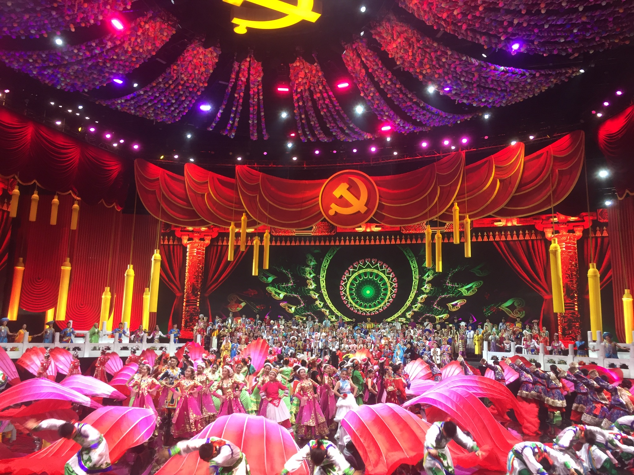 與舞臺美術(shù)一起打造一臺莊嚴(yán)、宏大的慶祝黨的十九大勝利召開的文藝晚會,必定要少一些平日電視欄目燈光“秀”的成分,一切以滿足節(jié)目需要而出發(fā)?!敖鹕薄凹t色”的主色彩應(yīng)用,貫穿晚會始終。