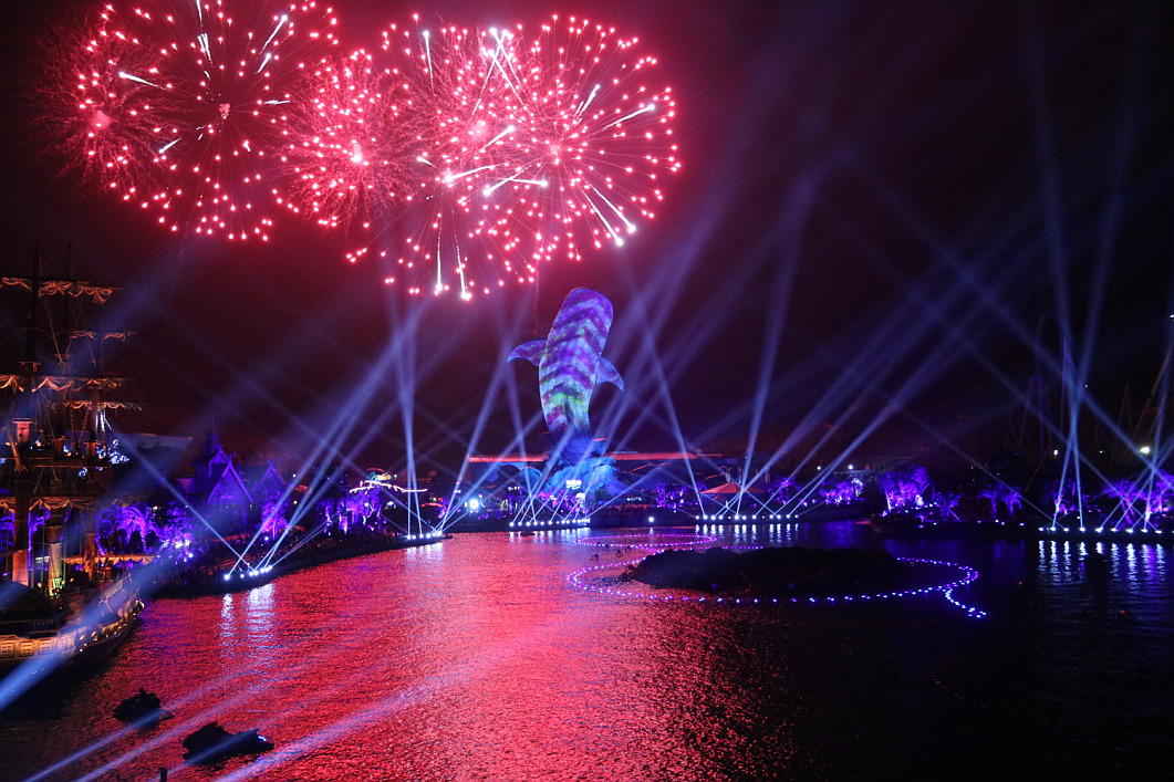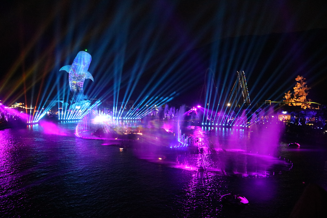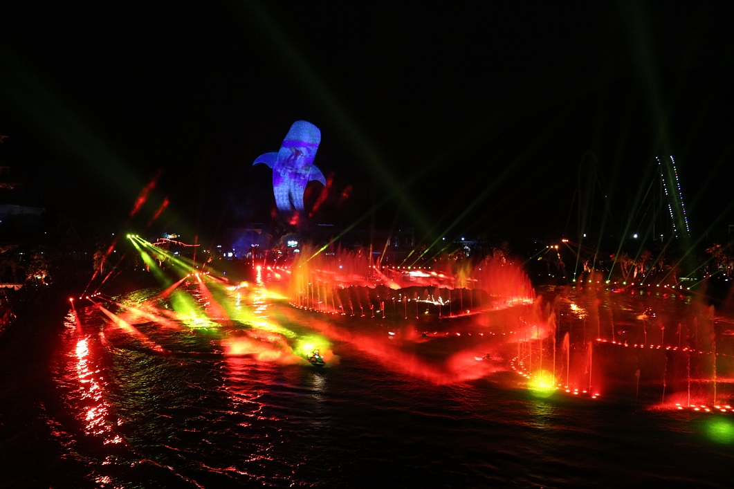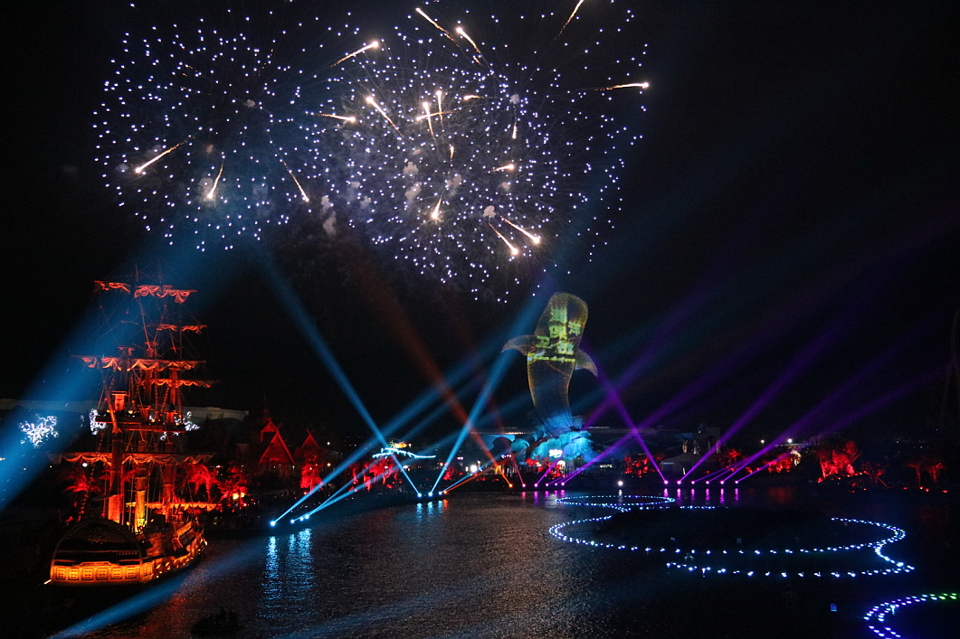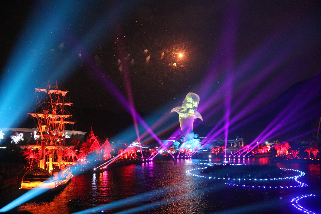 這是一場集無人機(jī)、煙花表演、燈光秀、激光秀、噴泉匯演、水上飛人、摩托艇特技等元素的震撼視覺盛宴,炫酷的燈光與幻彩的煙花點(diǎn)亮了整個海洋王國的夜空。浩洋燈具以品質(zhì)穩(wěn)定、功能完善、高亮度輸出、色彩效果豐富等特點(diǎn)完美完成了燈光演出,炫麗的光束伴隨著音樂舞動,在黑夜中劃出美麗的弧線,讓現(xiàn)場觀眾體驗(yàn)光束伴隨著強(qiáng)勁音樂節(jié)奏所締造出的燈光波浪,其出色的燈光科技表現(xiàn)手段贏得了長隆集團(tuán)的深度肯定及認(rèn)同。