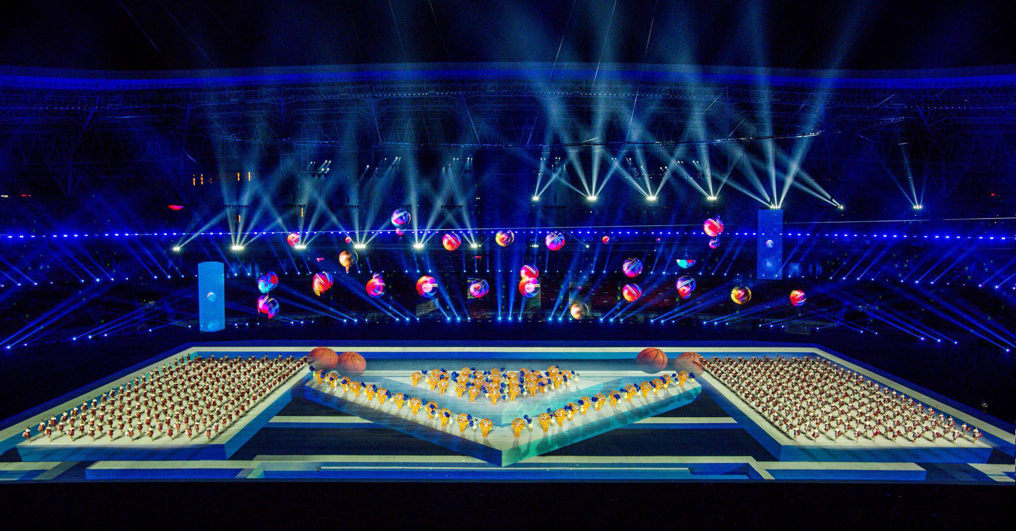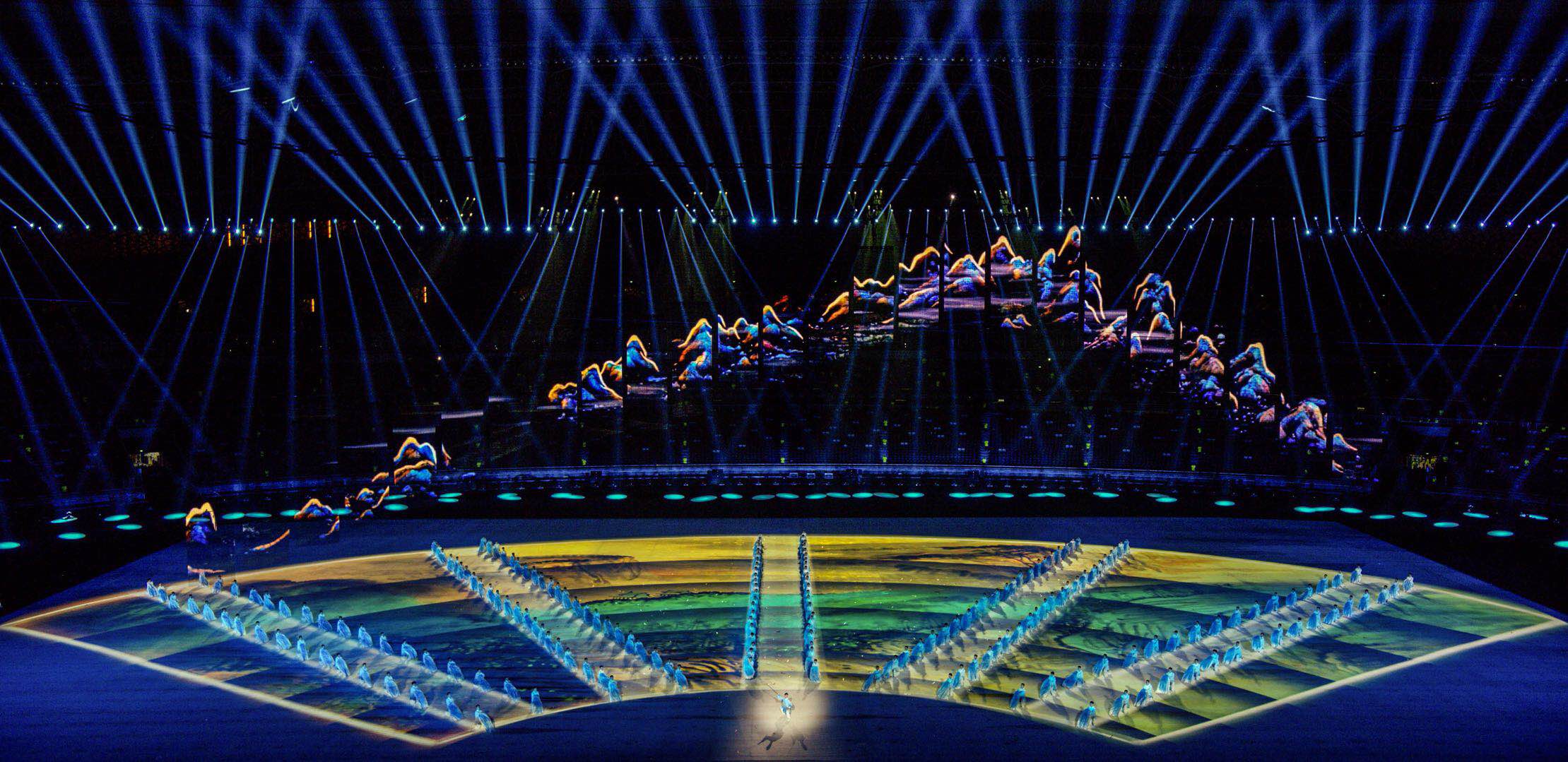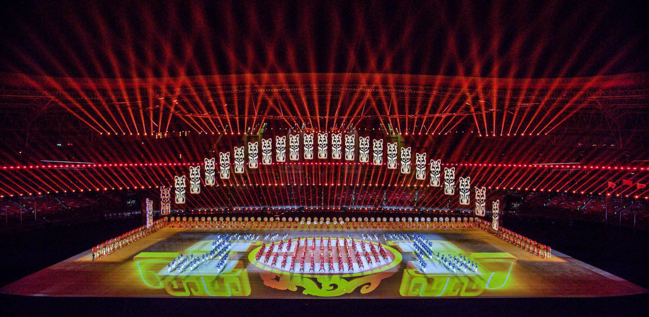 運(yùn)動會開閉幕式整體設(shè)計(jì)的核心理念為“奮斗幸福觀”,開幕式的主題為“奮斗新時代“,閉幕式將以“幸福新征程”為主題與之呼應(yīng)。開幕式演出運(yùn)用了大型燈光設(shè)備、舞臺機(jī)械裝置、高清投影設(shè)備、懸掛表演裝置、先進(jìn)音響設(shè)備、空中飛行設(shè)備等多種技術(shù)手段,形成地面、舞臺、空中三維藝術(shù)呈現(xiàn)形式,將中國傳統(tǒng)文化與國際先進(jìn)科技進(jìn)行完美結(jié)合,形成一臺國際化高水準(zhǔn)的全景化演出。