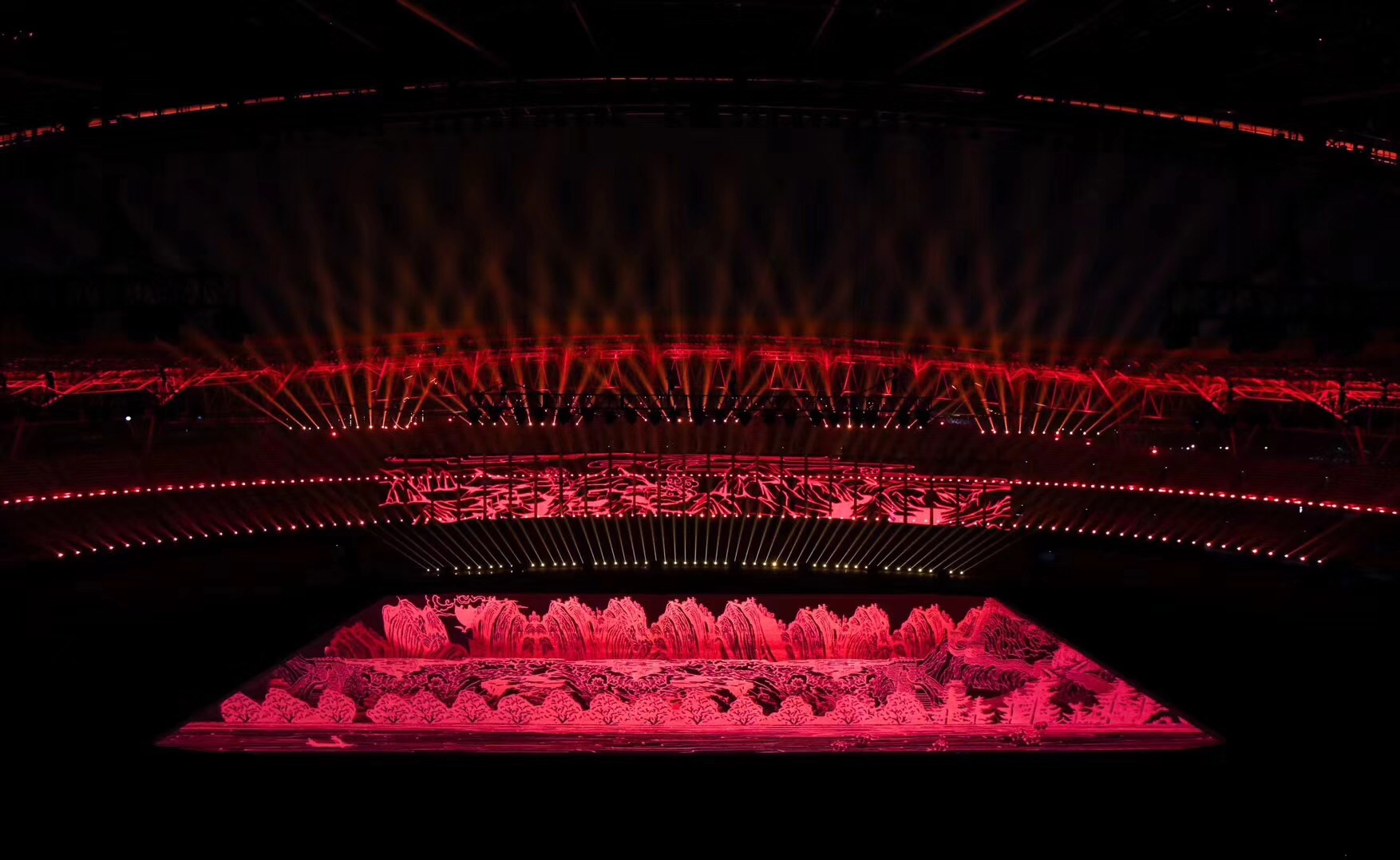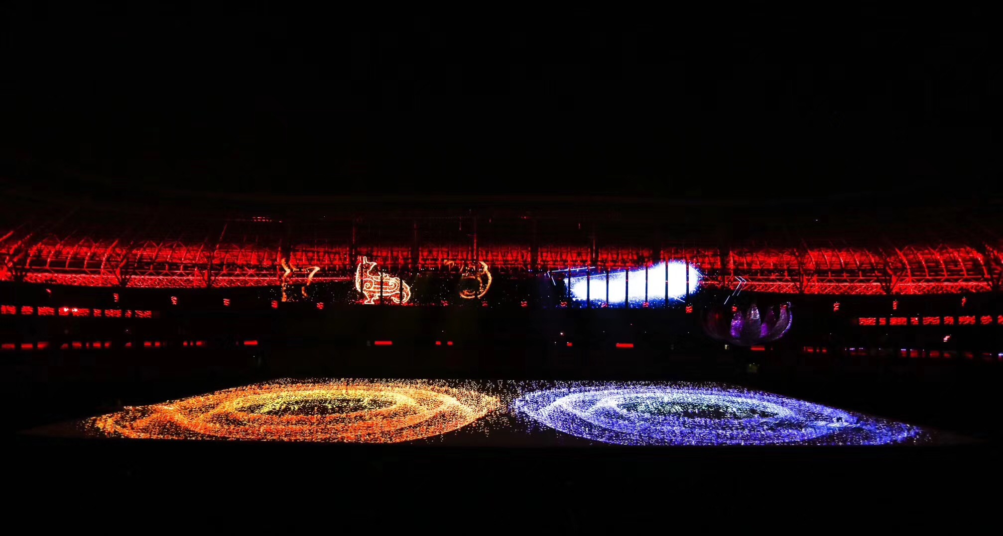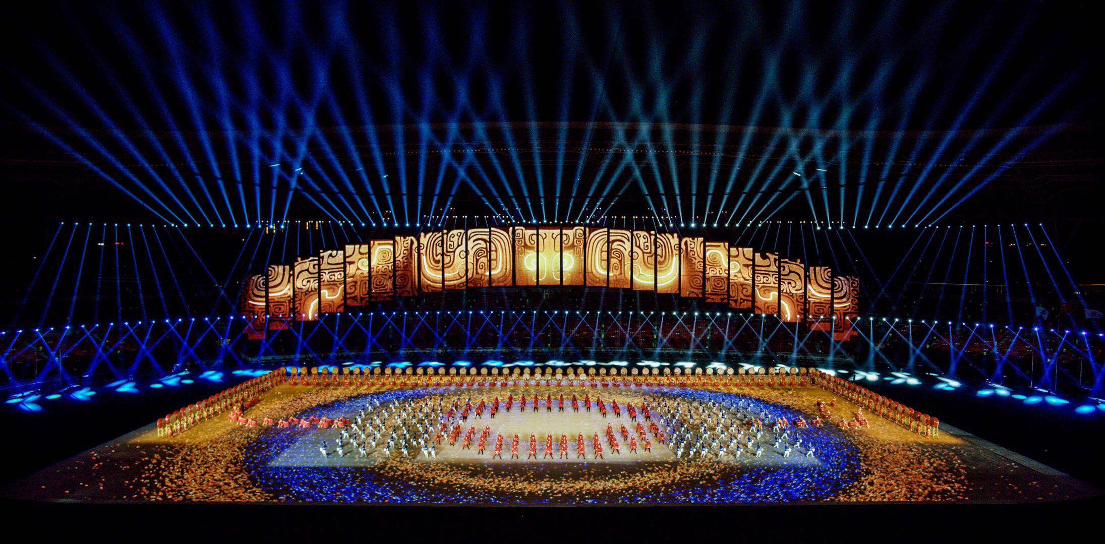 運(yùn)動會開閉幕式整體設(shè)計(jì)的核心理念為“奮斗幸福觀”,開幕式的主題為“奮斗新時代“,閉幕式將以“幸福新征程”為主題與之呼應(yīng)。開幕式演出運(yùn)用了大型燈光設(shè)備、舞臺機(jī)械裝置、高清投影設(shè)備、懸掛表演裝置、先進(jìn)音響設(shè)備、空中飛行設(shè)備等多種技術(shù)手段,形成地面、舞臺、空中三維藝術(shù)呈現(xiàn)形式,將中國傳統(tǒng)文化與國際先進(jìn)科技進(jìn)行完美結(jié)合,形成一臺國際化高水準(zhǔn)的全景化演出。