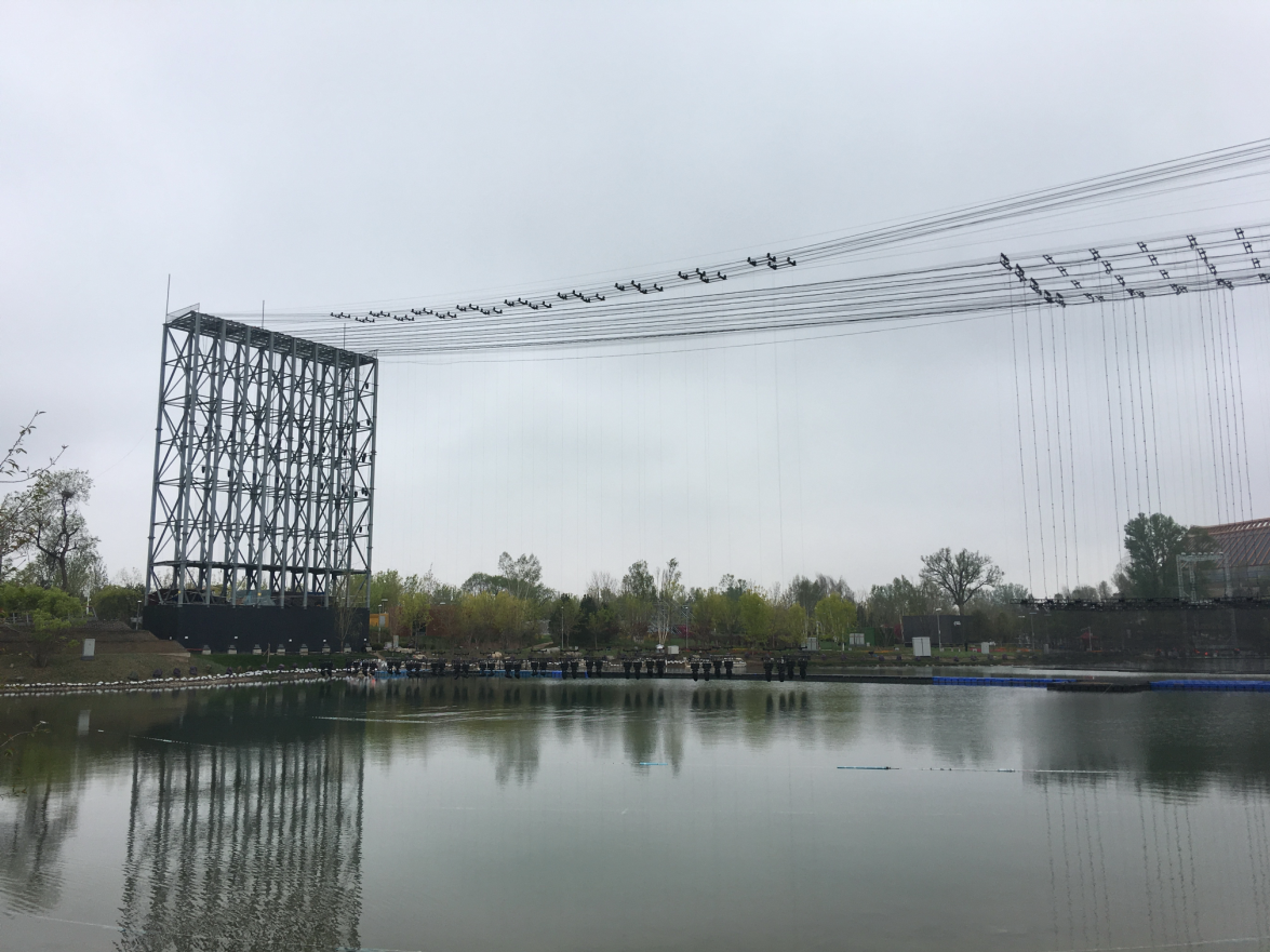 為了承載背景網(wǎng)屏和燈光設(shè)備,開(kāi)幕式專門(mén)臨時(shí)搭建了兩座鋼結(jié)構(gòu)威亞塔架,塔高39米,塔間跨度280米。塔間共搭設(shè)重型威亞索道16套,吊點(diǎn)總數(shù)218個(gè)。使用威亞控制系統(tǒng)將藝術(shù)空間擴(kuò)展升華,空中矩陣隱形LED屏幕、空中矩陣數(shù)控飛燈等與地面舞臺(tái)表演完美結(jié)合,給觀眾帶來(lái)超強(qiáng)的視覺(jué)震撼效果。