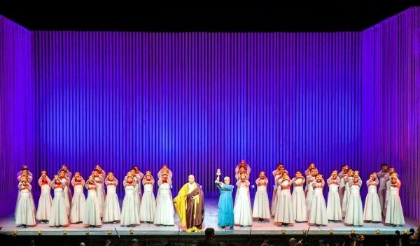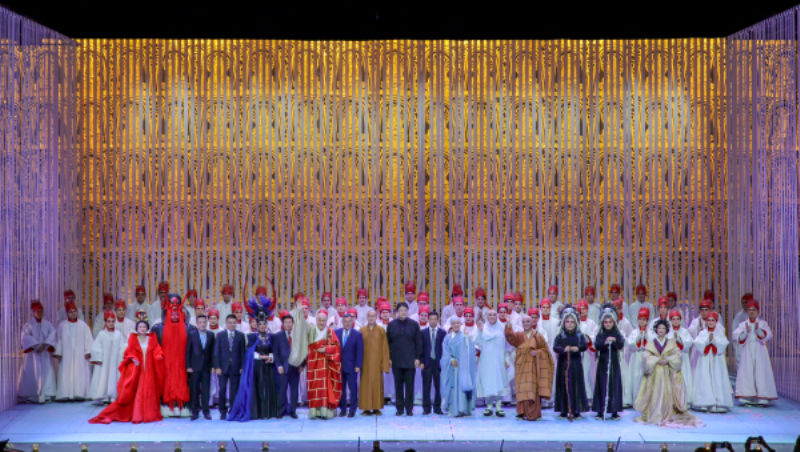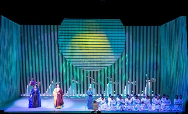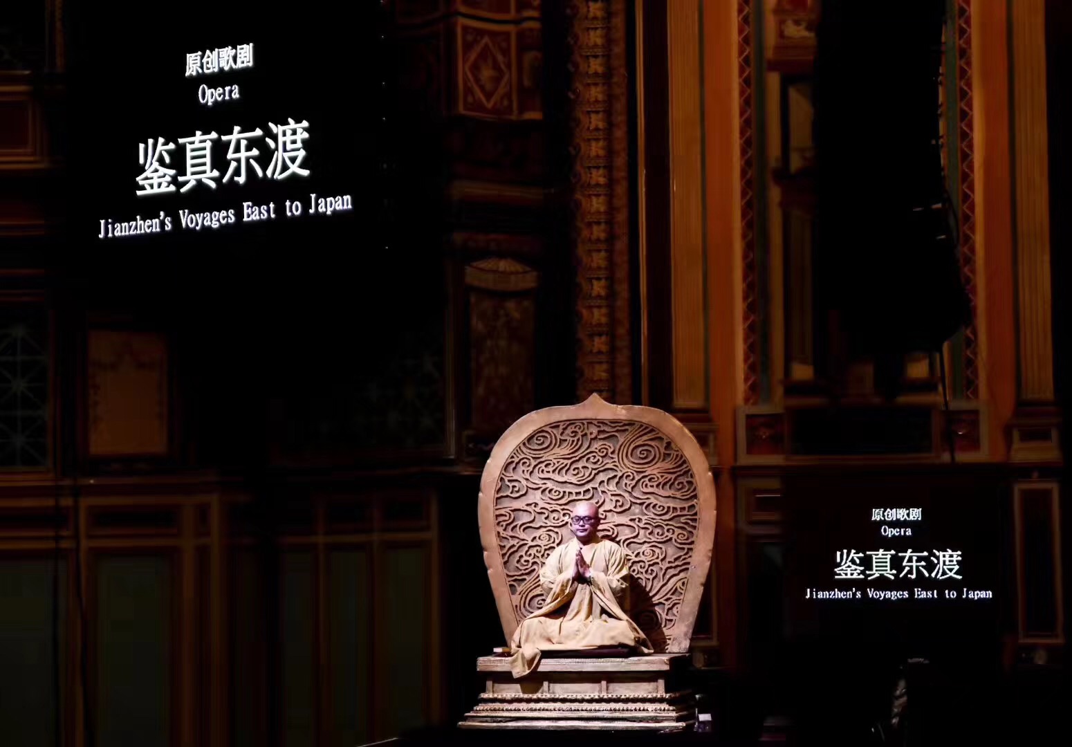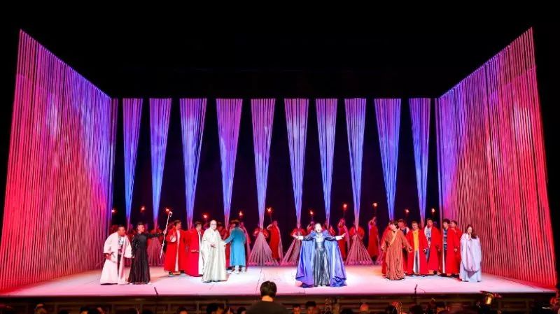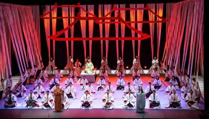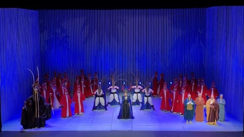 《鑒真東渡》運用歌劇這一國際通識的藝術(shù)表達(dá)話語,配合有感染力的表演,富有創(chuàng)意的舞美燈光設(shè)計,生動、立體的人物架構(gòu),在遵循歌劇藝術(shù)規(guī)律的基礎(chǔ)上,創(chuàng)造性地將江蘇民歌元素和佛教音樂的旋律融入其中,讓歌劇更富有地域特色,呈現(xiàn)出不同于純粹西方歌劇的風(fēng)格,展現(xiàn)出東方所特有的歷史厚重感與人文風(fēng)貌。