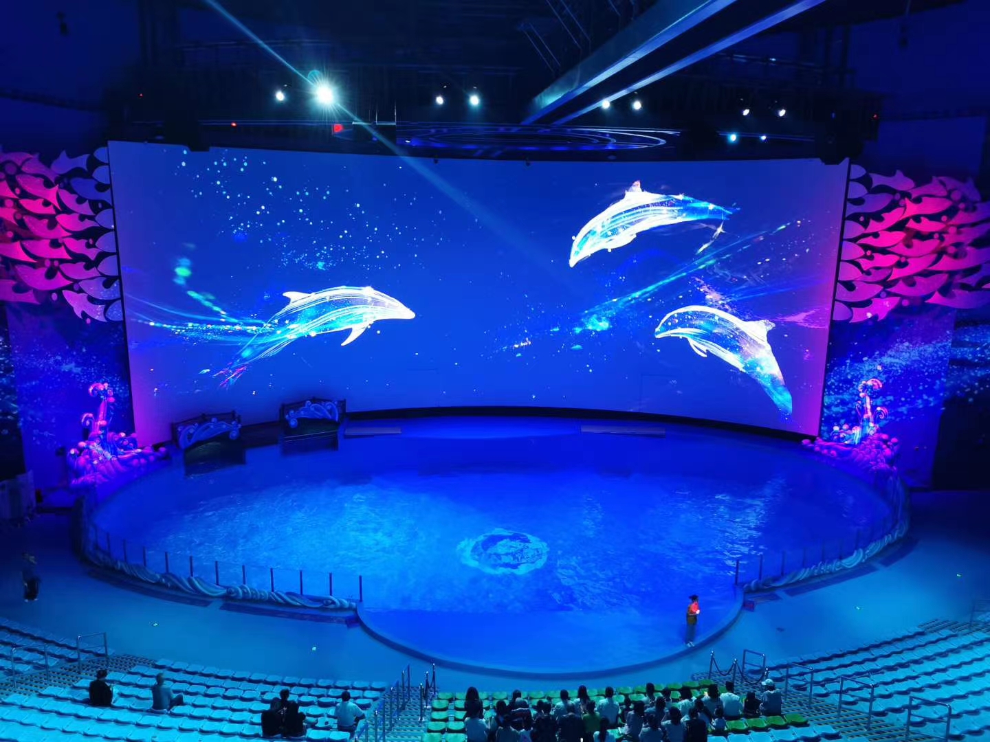 夢幻海豚劇場,超大海洋觀景空間,通過燈光與聲音營造場景氛圍,引導及推動表演的進行。一幕幕獨特新穎的表演形式、炫彩華麗的燈光舞美,讓人仿佛置身深邃的海洋之境,感慨人與自然的和諧共處。