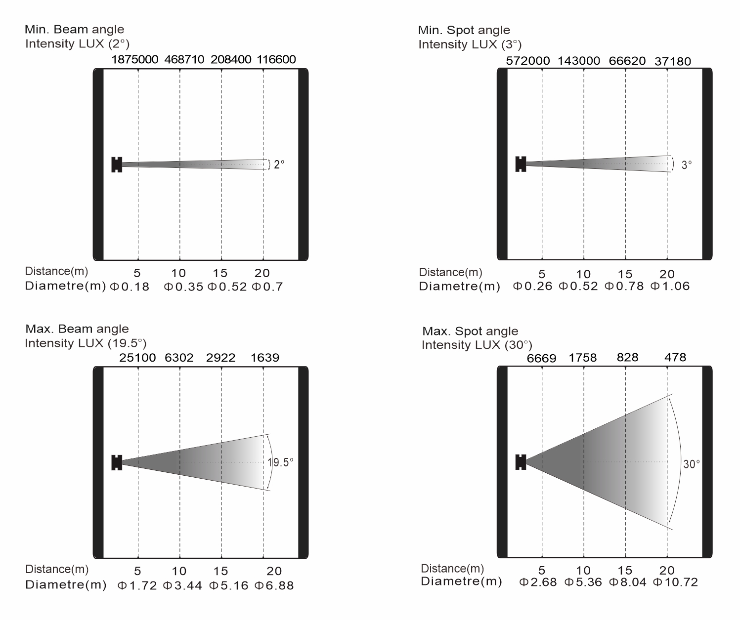 變焦范圍:光束模式:2°-19.5°,圖案模式:3°-30°